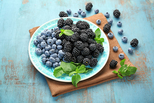 Plate with delicious ripe blackberries and blueberries on wooden background