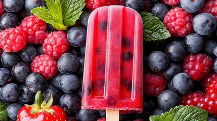 Red and blue fruit popsicle with a green leaf on top. The popsicle is surrounded by a variety of berries, including blueberries and raspberries