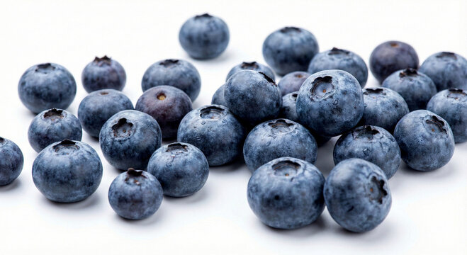Fresh blueberries scattered on a clean white surface, showcasing their vibrant blue color and plump texture.