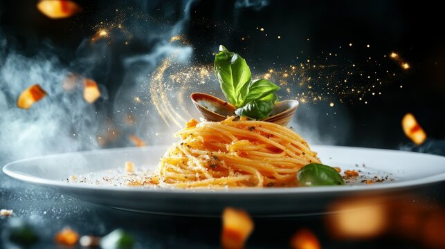 Perfectly cooked spaghetti entwined with fresh clams, garnished and steaming in a cozy kitchen