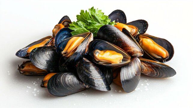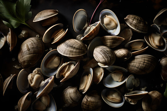 A vibrant arrangement of fresh clams and mussels on a marble slab with a sprinkling of sea salt.