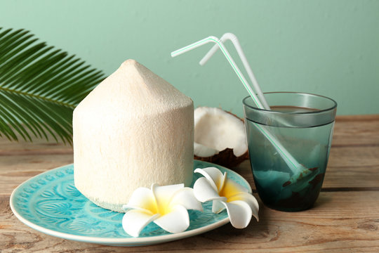 Composition with fresh coconut and glass of cocktail on wooden table