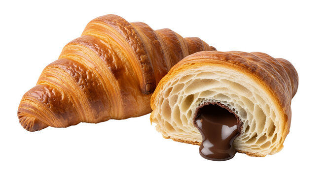 Delicious fresh French croissant with chocolate on a white background, perfect sweet breakfast pastry