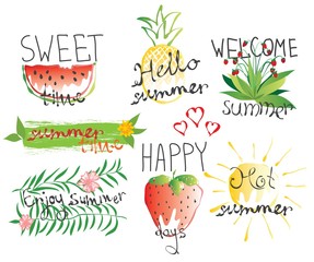 Vector summer card with sweet watermelon, strawberry, pineapple, hot sun. Hand drawing stylish background with text