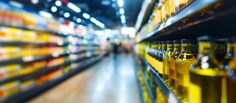 Blurred supermarket aisle with shelves full of products for shopping and groceries