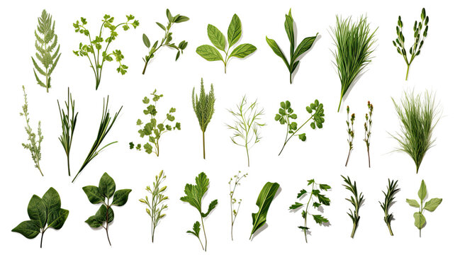 A collection of fresh aromatic herbs including sage, rosemary, basil, and thyme, cut out transparent