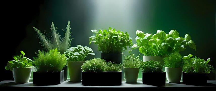 Fresh herb sprigs arranged in a row show mint basil and other leafy greens for culinary garnish and flavor and a colorful display for kitchen decor.