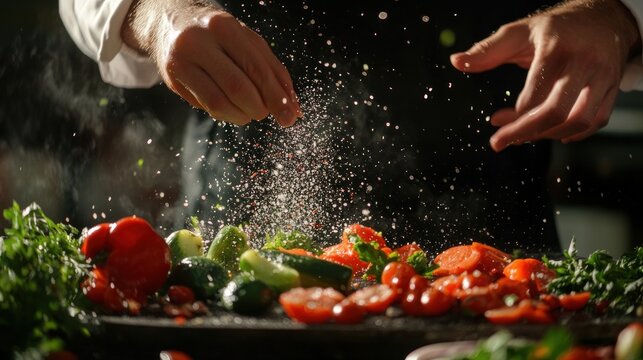 Chef preparing fresh ingredients for gourmet dish in modern kitchen