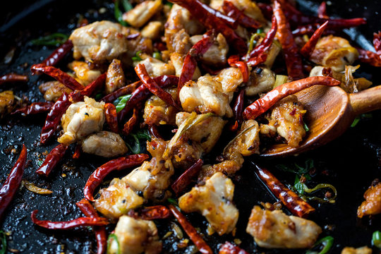 Assorted seasoned raw meat on a dark backdrop in a top-down view with room for a copy space image.
