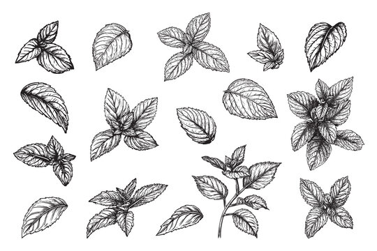 set / collection of fresh green mint leaves, twigs and tips in different positions isolated over a transparent background, cut-out cooking / food, cocktail, tea or essential oil design elements, PNG