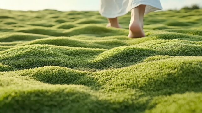 Bare feet walk across green moss ground. Person in white garment walking. Gentle sunlight on the grass surface with many green hills.