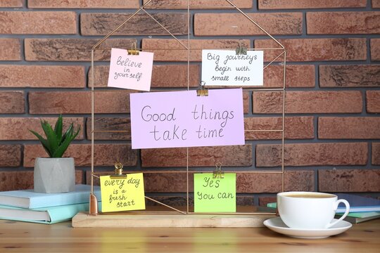 Notes with motivational quotes, coffee, houseplant and books on table against brick wall