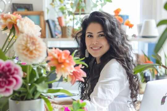 a Hispanic woman arranging her workspace with fresh flowers and motivational quotes