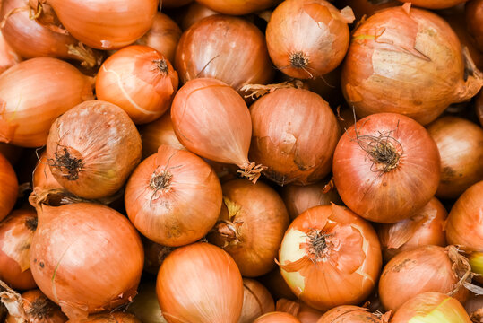 Onions on top of each other for sale at a vegetable store. Texture of the bulbs.