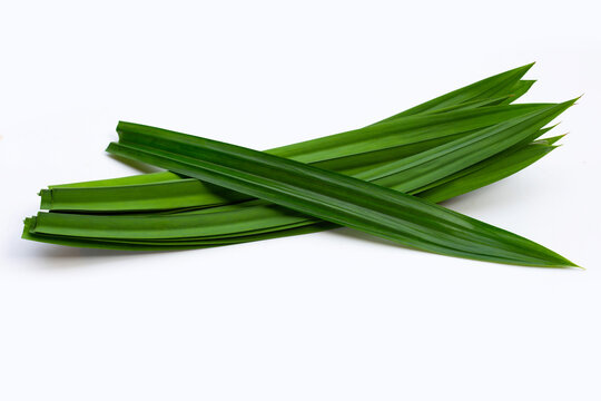 Green fresh Pandan or Screw pine leaves plant isolated on white background. Thais use it for cooking that give good smell and get green color from nature in food and beverage. It values as Thai herb.