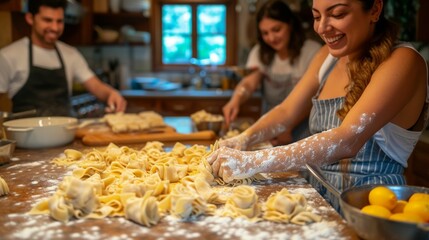 A skilled chef delicately twirls strands of pasta with a fork, adding rich sauce and garnishing with herbs in a busy kitchen. The warm lighting enhances the inviting atmosphere