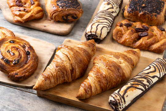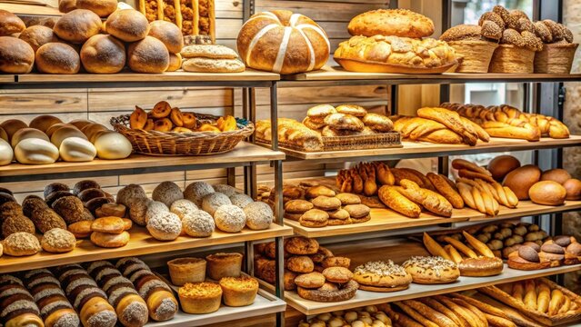 Variety of fresh bakery goods on display, bakery, pastries, bread, muffins, croissants, display, selection, tasty