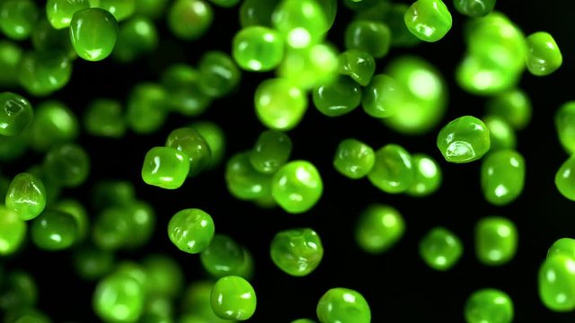Fresh green peas exploding. Shot with high speed cinematic camera. Super slow Motion.
