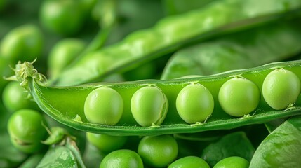 Pods of green peas on a black background, highlighting high contrast and the vividness of the fresh vegetable. Studio lighting.