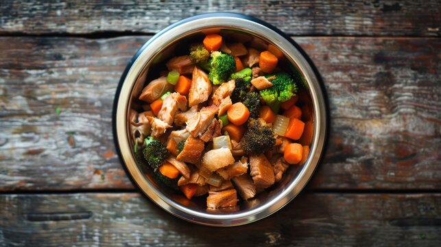 Mixed dry dog food with boiled chicken carrots and broccoli in the dog s food bowl