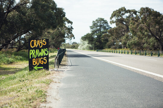 Roadside sign advertising fresh crays prawns and bugs for sale horizontal