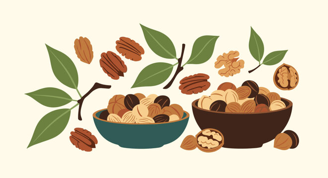 Healthy food illustration with bowls of mixed nuts including pecans and walnuts with scattered nuts and fresh green leaves.