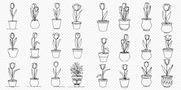 A collection of hand-drawn black and white illustrations featuring various potted plants, including tulips and a succulent, in different styles of pots.
