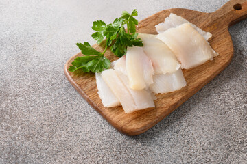 Atlantic fish smoked halibut served on wooden cutting board on gray background. Close up. Copy space. Unsaturated fats and omega 3 fats source. Brain food.