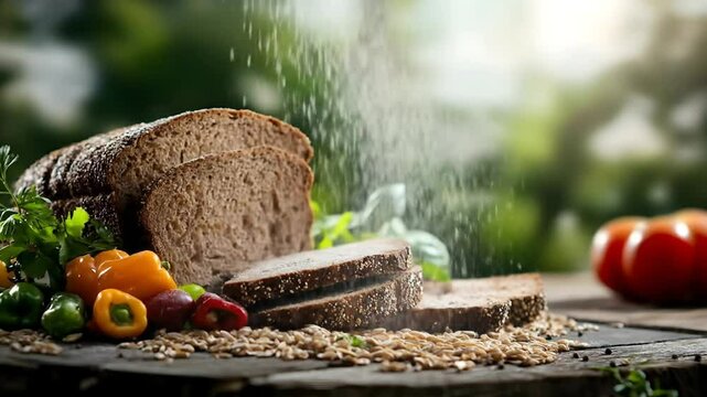 Freshly sliced whole grain bread on rustic wooden table, surrounded by colorful vegetables and scattered grains, with flour falling from above