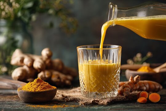 Golden turmeric latte in cozy kitchen with fresh ginger and spices creates warm morning vibes