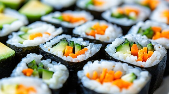 Close up of freshly made vegetarian sushi rolls with avocado, cucumber, and carrot.