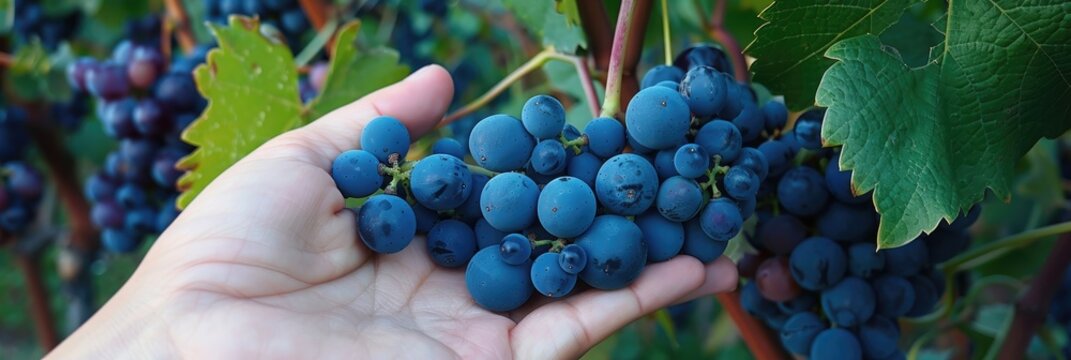 Appreciation for Large Blue Grape Bunch with Hand Gesture for Size Comparison in Vineyard