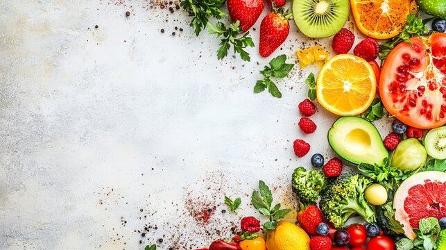 Healthy fresh vegetables and fruits for balanced diet and weight loss nutrition background