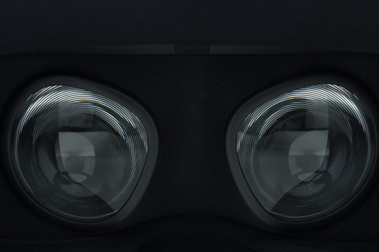 Closeup of fresnel lenses on a black virtual reality headset.