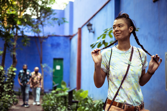 Portrait of a woman made of flowers. Frida Kahlo inspired artwork on colorful textured paper with copy space