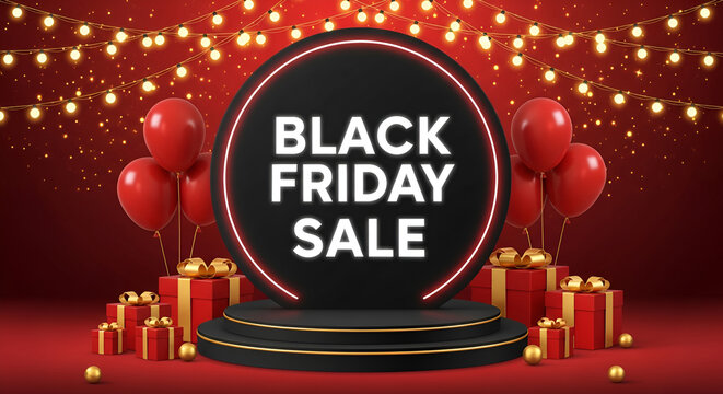 Black friday sale neon sign display with gifts and balloons