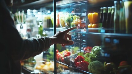A person enjoys a vibrant moment pouring vitamins into their hand near a fridge brimming with fresh produce and healthy options