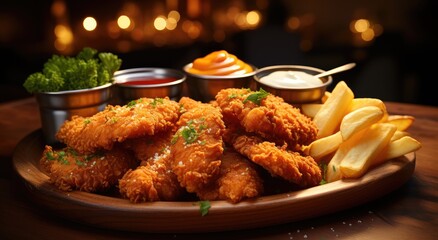 A delicious and indulgent plate of crispy fried chicken and golden french fries, a classic comfort food dish that brings the savory flavors of deep frying to your table in a fast food style cuisine,