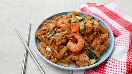 Kwetiaw or Kwetiau seafood, fried rice noodles with prawn or shrimp and vegetables. Popular in Indonesia served on blue plate isolated on grey