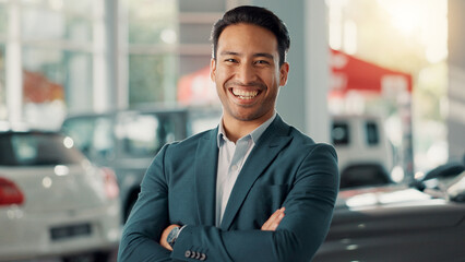 Businessman, portrait and laugh with confidence for car dealership, customer service and transport for rental. Showroom, male person and seller with arms crossed for assistance, vehicle shop or smile