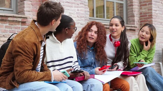 A lively group of students sharing excitement while discussing their homework, engaging with each other and enjoying their time together in a cheerful and friendly atmosphere filled with laughter.