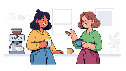 Modern flat vector illustration of women chatting during office coffee break in kitchen area, friendly style, ideal for workplace lifestyle visuals