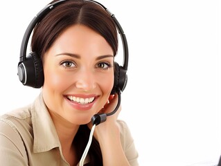 A customer service representative in a headset assisting a customer with a smile and helpful attitude