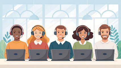 Diverse team of smiling customer service representatives wearing headsets and working on laptops in a bright modern office setting