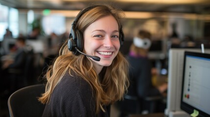 A young woman with a bright smile wears a headset while providing assistance in a bustling call center. Colleagues are focused on their tasks, creating a lively atmosphere