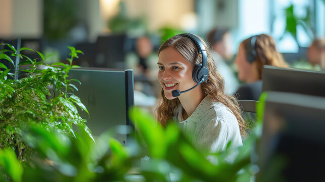 A smiling customer service representative wearing a headset in a green office.