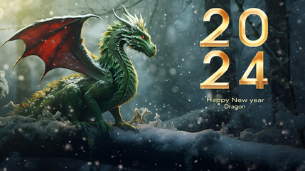 Green dragon symbol of 2024 in a snowy fairy forest with golden numbers 2024 and copy space. gothic style. 2024 Happy New Year greeting card concept.