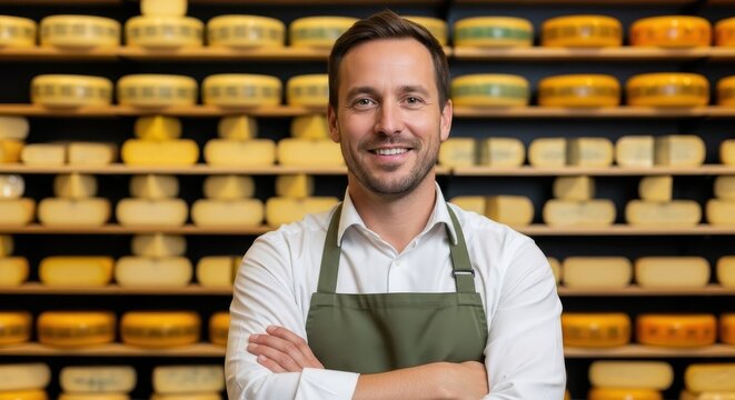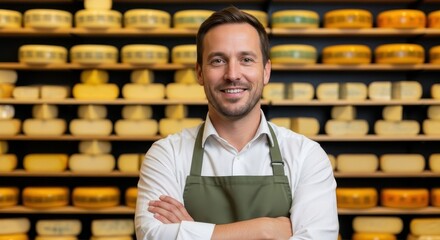 Smiling Man with Apron in Gourmet Cheese Shop Surrounded by Delicious Dairy Varieties