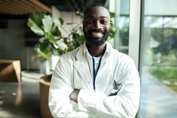 Confident Black male doctor standing in hospital wearing a lab coat and smiling