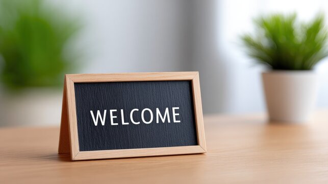 Welcome sign on table with plant in background